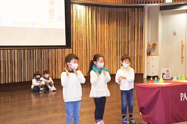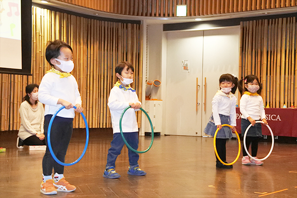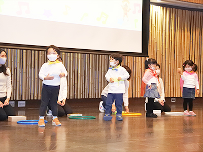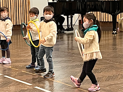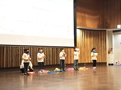 リトミック科発表会(vol.19)2022年12月11日(日):長岡京市中央生涯センター 3Fメインホール 今年度は数年ぶりの会場での開催となりました。 会場の扉を開けた瞬間「わぁ広~い!」と目を輝かせる子どもたち。そんな広い舞台に負けないくらい身体いっぱい大きく発表してくれました。 今回のテーマは『お城』。ちょっと不思議でとても素敵なお城へ冒険の旅が始まります。 下記の各写真をクリックすると拡大表示されます ステップ①のおともだち 下記の各写真をクリックすると拡大表示されます プレ2才のおともだち 下記の各写真をクリックすると拡大表示されます ステップ②のおともだち 下記の各写真をクリックすると拡大表示されます ステップ③のおともだち 下記の各写真をクリックすると拡大表示されます ステップ④のおともだち 下記の各写真をクリックすると拡大表示されます ステップ⑤のおともだち 下記の各写真をクリックすると拡大表示されます